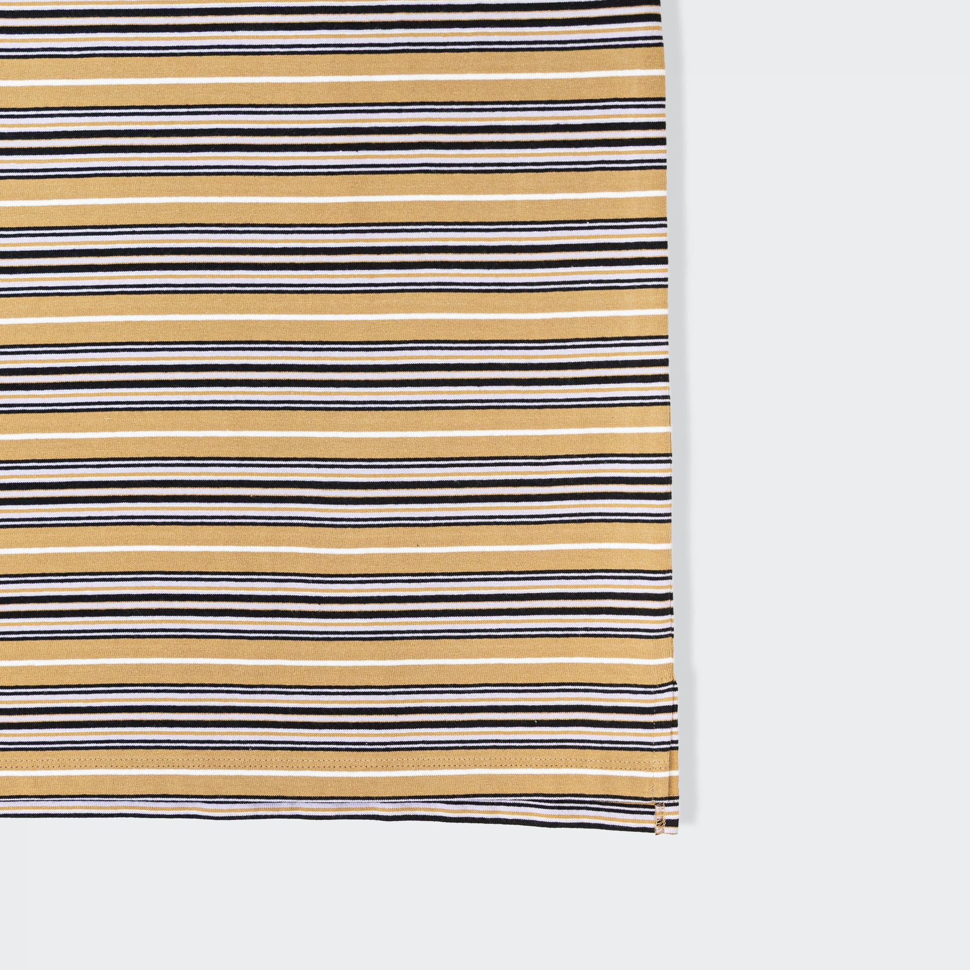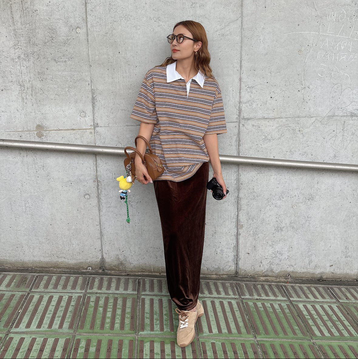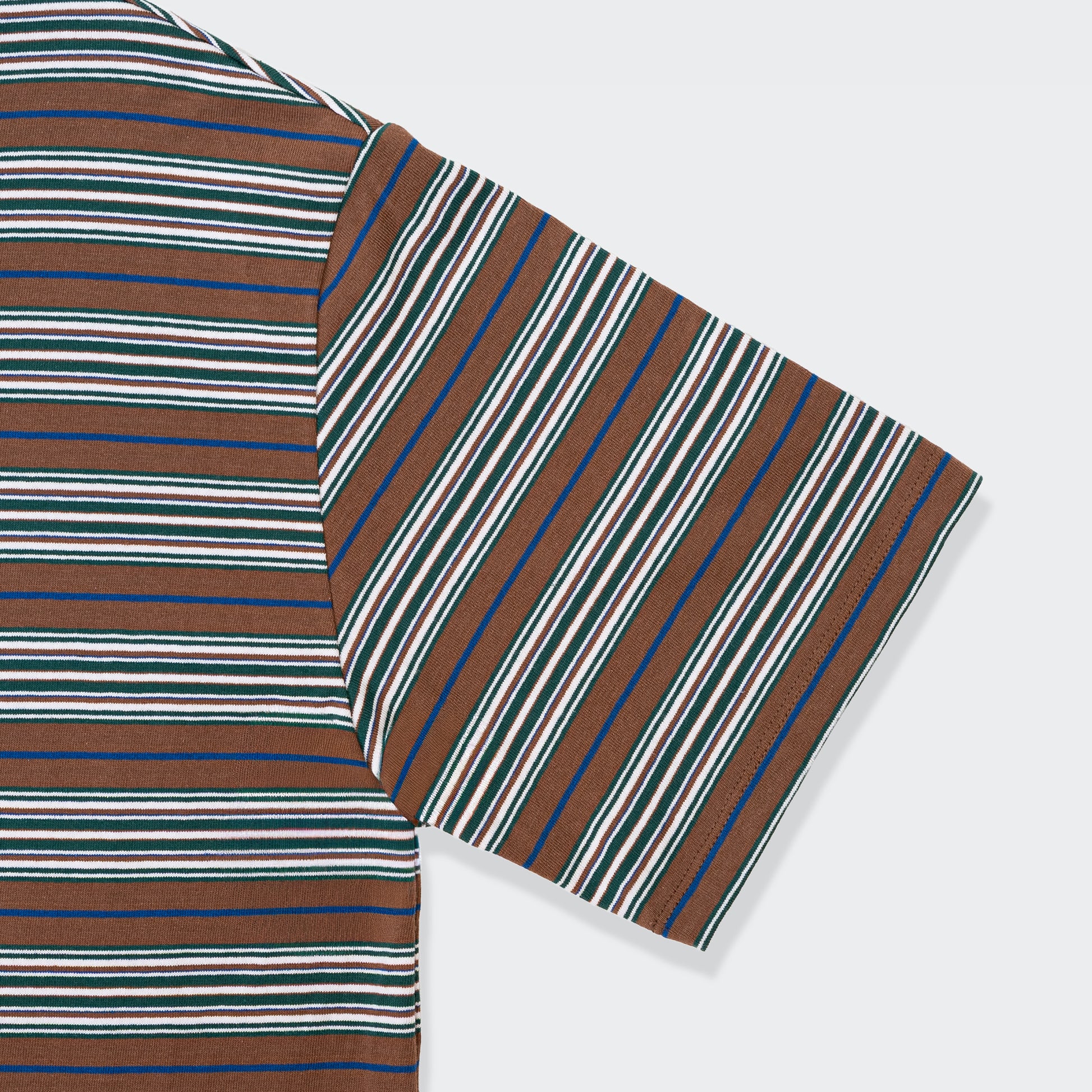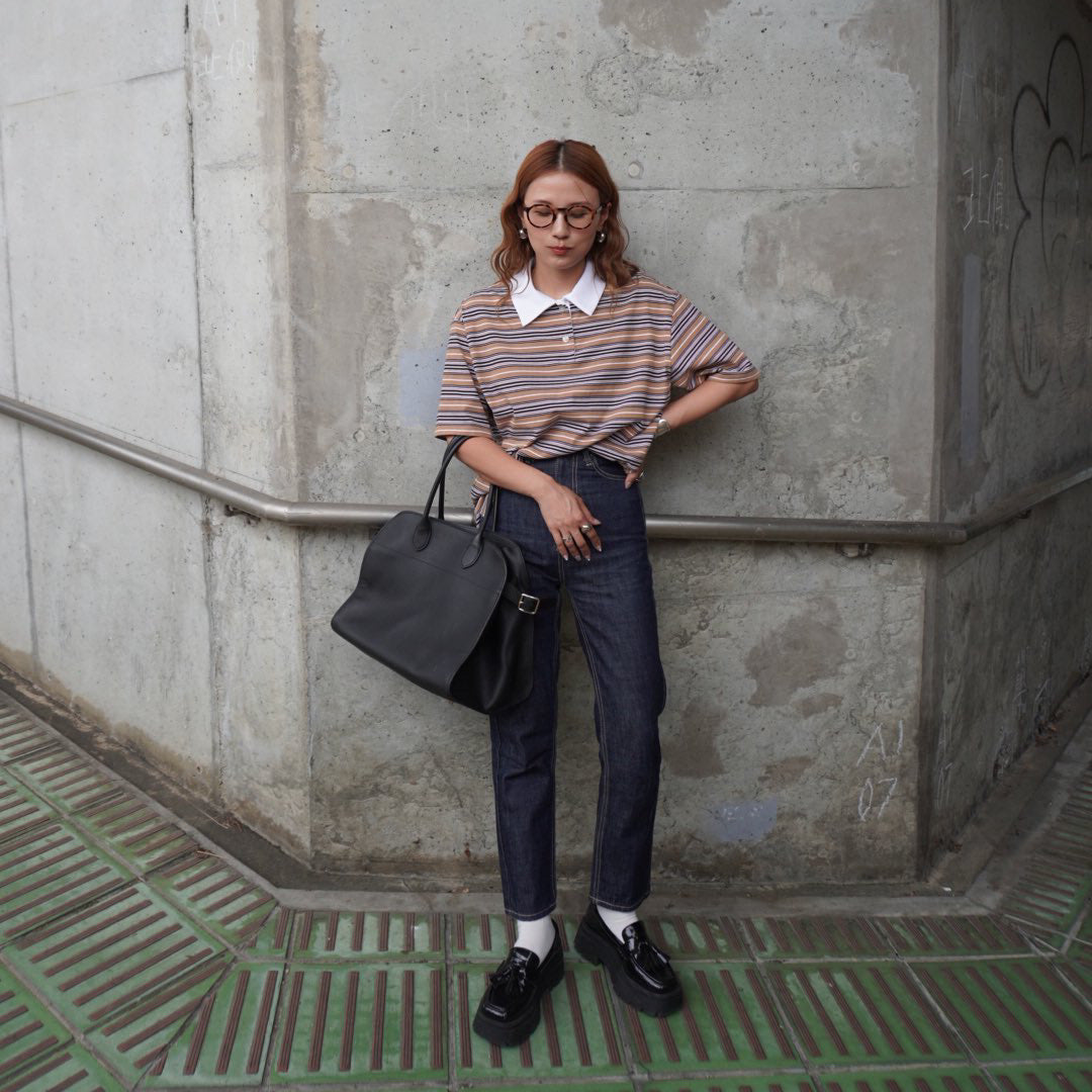 ポロ衿で程よいきちんと感を残しつつ、ボーダー柄とロング丈で旬のシルエットを演出したシャツ。
