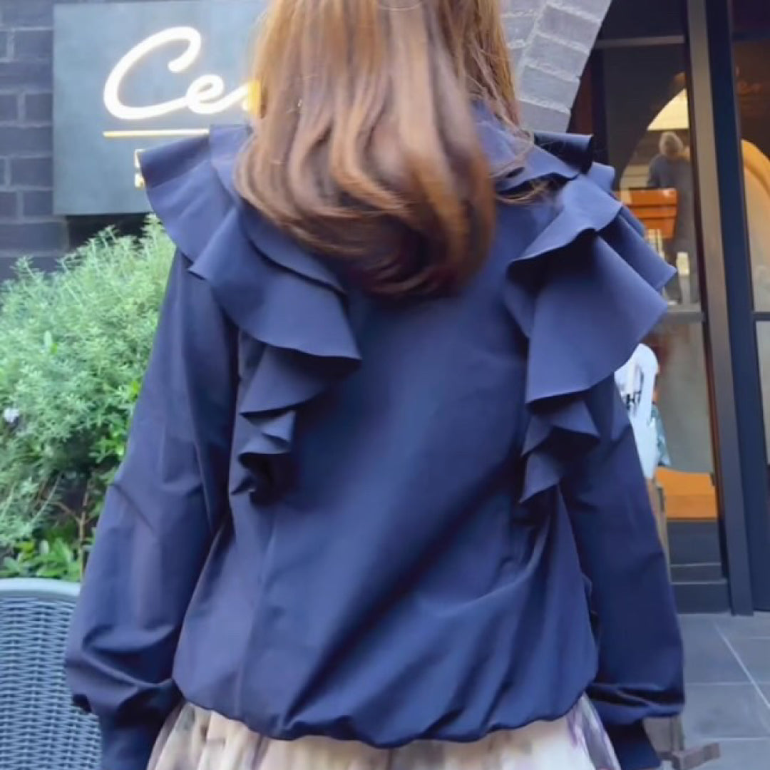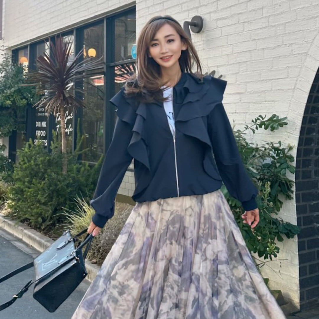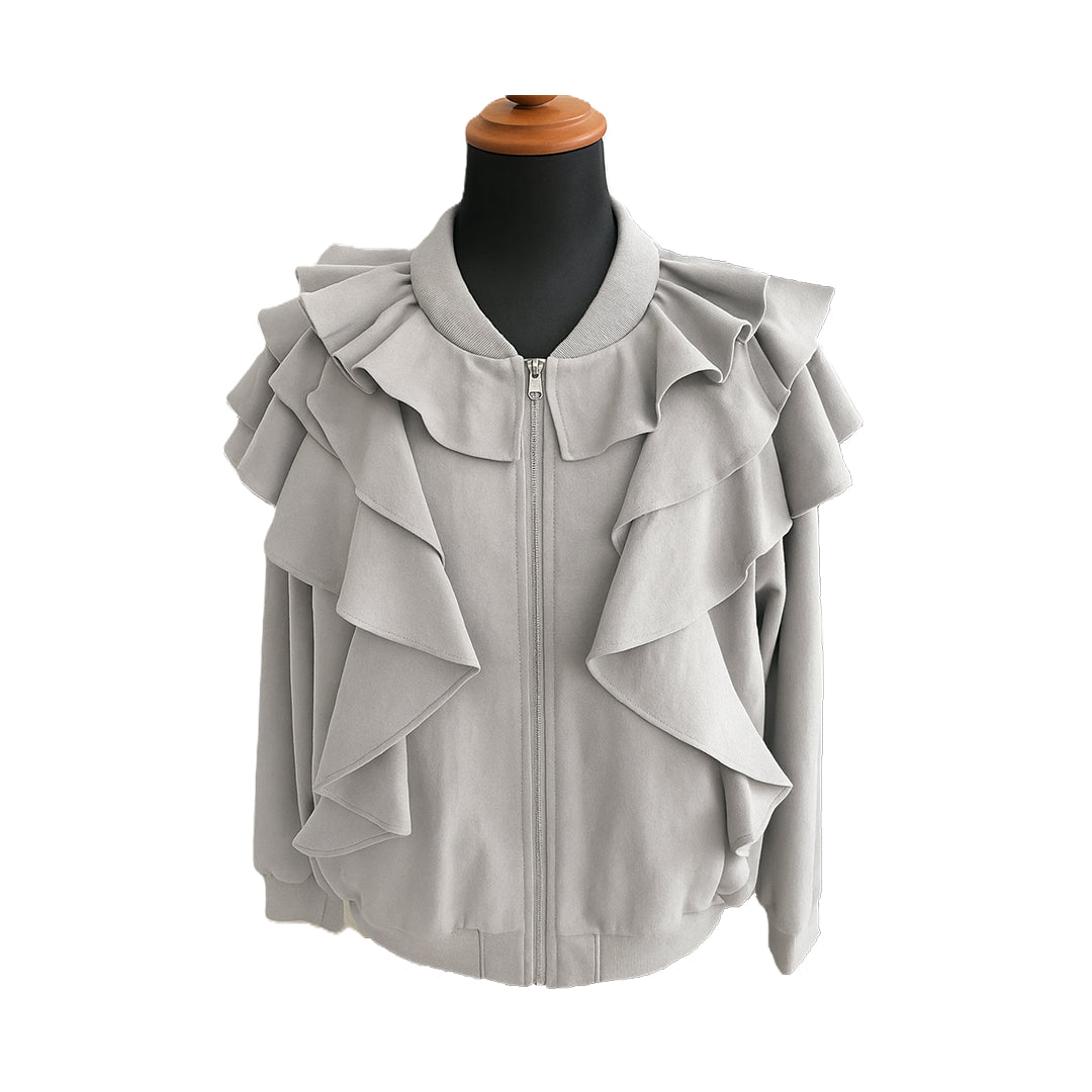華やかなフリルをあしらい、羽織るだけで上品な印象を与えるブルゾン。