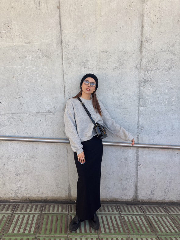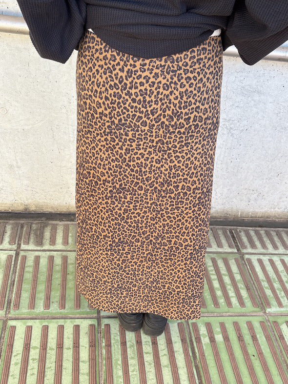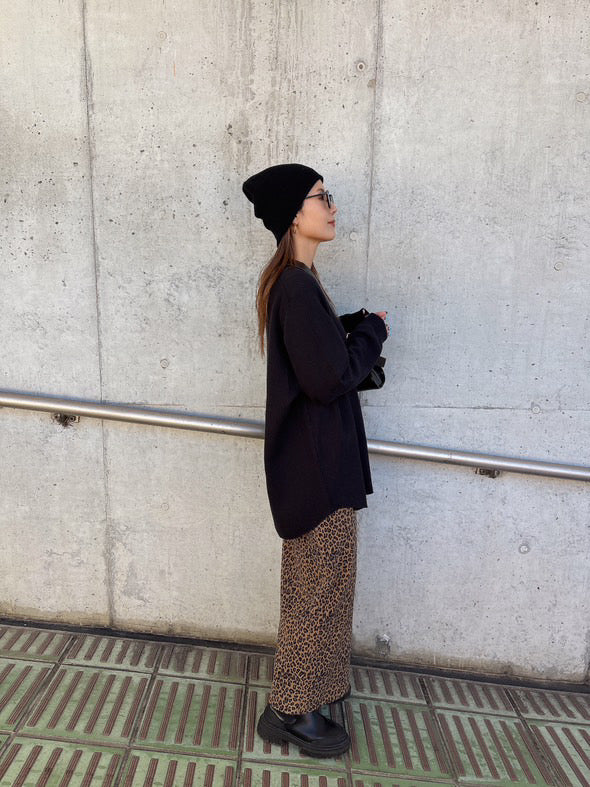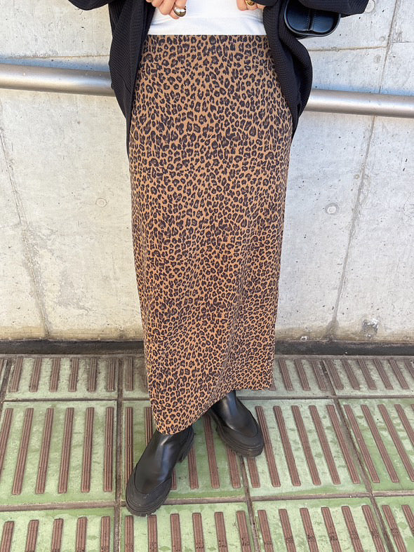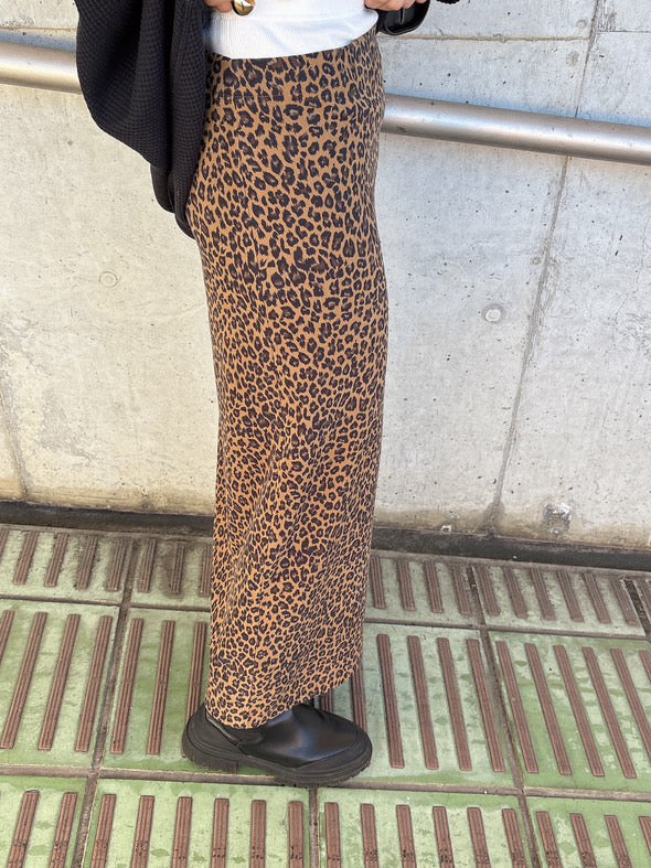 レオパード柄で存在感を出しつつ、ウエスト部分にレイヤード風のリブデザインを取り入れたロングスカート。
